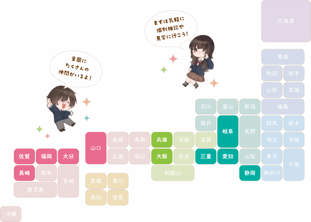 こころ未来高等学校は全国各地にサポート校(夢末来高等学院)を設置しています。夢未来高等学院は、こころ未来高等学校サポート校通学コースに在籍する生徒が3年間で卒業できるよう、単位修得・進級などの支援をおこなう教育施設です。夢未来高等学院の生徒は、レポートなどの提出やスクーリング、試験を経て、進級・卒業をめざします。夢未来高等学院では、生徒一人ひとりに寄り添い、学習に不安を感じている生徒にも手厚く学習支援をおこなっています。